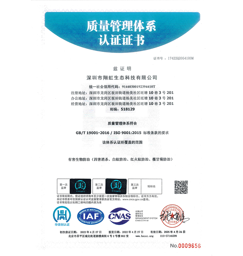 深圳市翔虹生態科技有限公司成立于1995年,是深圳最早成立的專業蟲害防治公司之一。公司發展至今獲得全國有害生物防制服務A級資質、廣東省有害生物防制服務A級資質、深圳市有害生物防制服務A級資質、廣東省有害生物防制服務A級資質、深圳市有害生物防制服務甲級資質的單位,是中國有害生物防治協會會員、廣東省有害生物防治協會會員、深圳市有害生物防治協會理事單位,多次獲得“深圳市十佳消殺單位”榮譽。